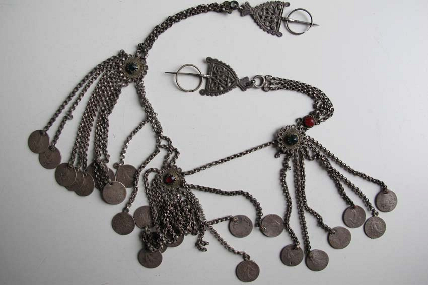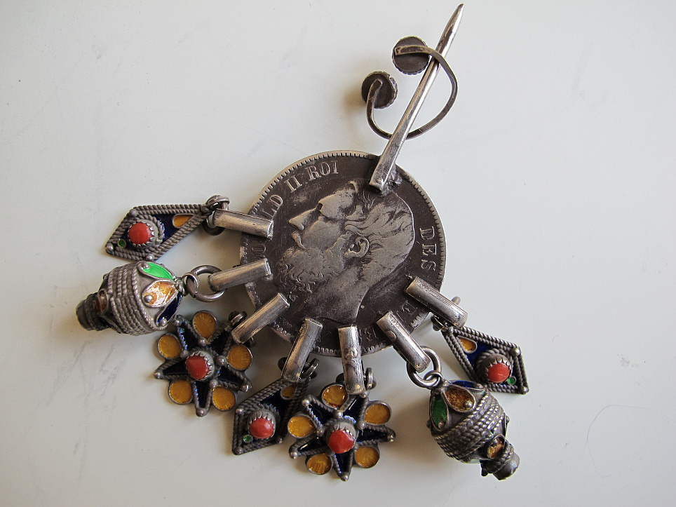 Although the jewels are made of traditionally used metals and gems, formally following the style of Berber necklaces, brooches, bracelets and earrings, they additionally incorporate foreign objects that were imported by the colonial powers France and Belgium. There are pendant coins representing their reigns’ insignia: a portrait of Léopold II, an allegory of the French Republic. The jewelry does not only take up foreign countries’ monetary means of exchange but also seems to present them as an apotheosis of their morals and doctrines.