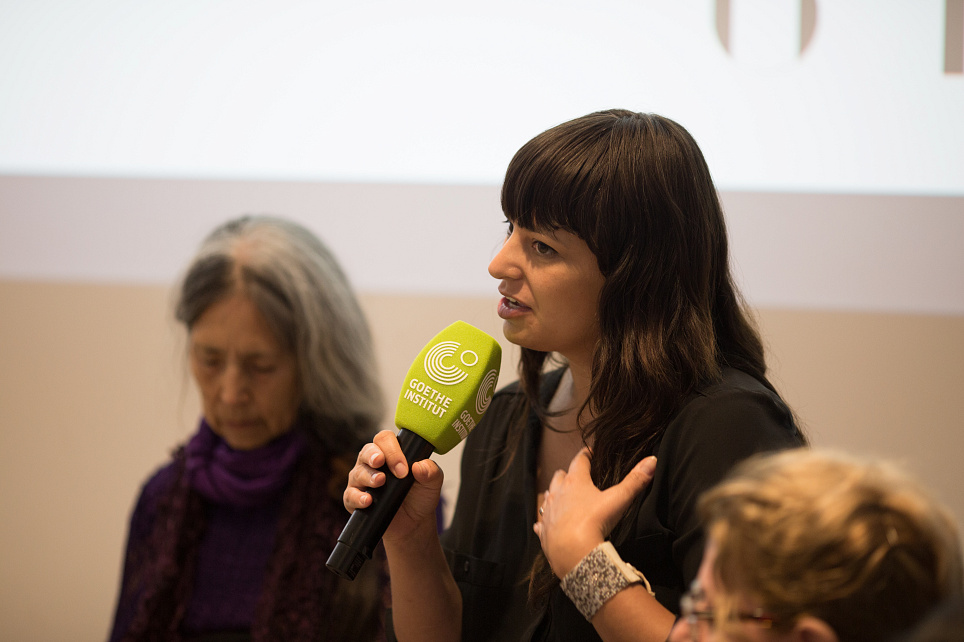 Candice Hopkins and Cecilia Vicuña (background) at the symposium bauhaus imaginista: Learning From at the Goethe-Institut New York, June 2018, photo: Daniel Albanese.